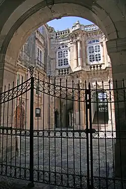 O pátio é pavimentado com elaborados paralelepípedos pretos e brancos, dando-lhe a aparência de um tapete desenhado no chão. Continuando pelos dois portões laterais ao central, se entra em outro pequeno pátio, com uma fonte suspensa com gárgulas e uma balaustrada vazada repleta de flores no terraço.