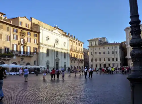 Vista do palácio à partir da Piazza Navona. À esquerda, a igreja de Nostra Signora del Sacro Cuore, antiga San Giacomo degli Spagnoli.
