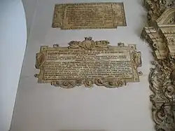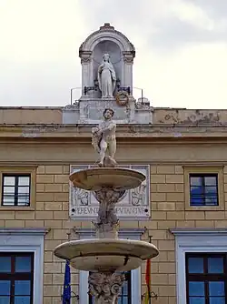 Nas laterais, encontram-se dois putti, ou assistentes, portando escudos, um com a águia, símbolo da cidade, e o outro com o brasão de Giovanni Ventimiglia, Marquês de Geraci, Príncipe de Castelbuono e Presidente do Reino. Acima das rampas, encontram-se as placas reais monumentais, documentadas na parte externa.[10][11]