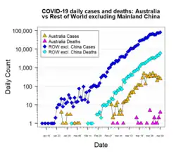 - ↑ «WA man becomes first Australian to die from coronavirus». 7 News. 1 de março de 2020. Consultado em 1 de março de 2020. Cópia arquivada em 1 de março de 2020