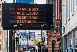 Em 23 de março, Boris Johnson anunciou em um canal de televisão que as medidas para preventivas seriam mais rigorosas, com restrições feitas à liberdade de circulação.[101] Johnson não mencionou a palavra "bloqueio", mas o termo foi amplamente adotado na mídia.[102] O governo instruiu as pessoas a ficar em casa durante todo esse período, podendo sair apenas para fazer compras essenciais, por necessidade médicas, ou para praticar exercício físico.[103] Muitas outras atividades não essenciais, incluindo todas as reuniões públicas e eventos sociais, exceto funerais, foram proibidas, com muitas categorias de empresas de varejo ordenadas a serem fechadas.[101][104]