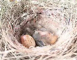 O filhote começa a emitir o chamado de “chip” logo após sair do ovo, e faz o chamado com frequência durante os primeiros dois terços do período de nidificação e constantemente no último terço.[23] O chamado não varia na presença de um adulto no ninho, portanto, parece provável que o chamado não seja direcionado ao pássaro adulto. O filhote fica em silêncio quando um adulto faz um chamado de alarme e emite um som de guincho quando o adulto entrega o alimento. O canto de pedido de um filhote é semelhante ao canto do filhote, mas significativamente mais alto e cobrindo uma faixa de frequência maior (o que pode torná-lo mais direcional). A taxa de vocalização, em média, é de 85 a 100 vocalizações em um minuto e, em áreas abertas, o chamado pode ser ouvido a até um quilômetro de distância. O subcanto, uma vocalização juvenil que inclui elementos de vários chamados, começa a ser emitido quando o filhote tem cerca de trinta dias de idade.[24]