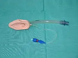 Uma máscara laríngea é um tubo com um manguito insuflável. Pode ser colocada na orofaringe inferior para evitar a obstrução dos tecidos moles da via aérea e criar um canal seguro para a ventilação. A máscara laríngea é a ventilação de resgate padrão quando a intubação endotraqueal não é possível. Para inserir esta via aérea no paciente, a máscara desinsuflada deve ser pressionada contra o palato duro, rodada para além da base da língua e na faringe. Uma vez que a máscara esteja na posição correta, pode ser insuflada. Algumas vantagens da máscara laríngea incluem a minimização da inflação gástrica e a proteção contra a regurgitação. Um problema potencial é que a insuflação excessiva pode tornar a máscara mais rígida e menos adaptável à anatomia do paciente, comprimindo a língua e causando edema da língua. Nestes casos, a pressão da máscara deve ser reduzida ou deve ser utilizada uma máscara maior. Se um doente não comatoso receber relaxantes musculares antes da inserção do tubo laríngeo, poderá sentir náuseas e aspirar após o efeito dos medicamentos. Nessa altura, a máscara laríngea deve ser removida imediatamente para eliminar a resposta de náuseas e ganhar tempo para iniciar uma nova técnica alternativa de intubação.[carece de fontes]