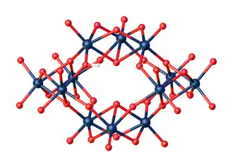42]10–, destacando sua simetria relativamente baixa. Esferas azul-escuras representam os átomos de tungstênio, as esferas vermelhas representam oxigênio e as brancas representam hidrogênio.