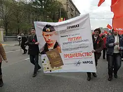 - Manifestantes comunistas com o sinal "a ordem de demissão de Vladimir Putin pela traição dos interesses nacionais", Moscovo, 1 de Maio de 2012