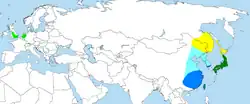 A espécie foi difundida no leste da Ásia, mas as exportações em larga escala e a destruição das florestas que lhes serviam de habitat, tem reduzido as populações deles na Rússia e na China para menos de 1000 casais em cada país. No entanto, no Japão ainda existem aproximadamente 5000 casais.[6]