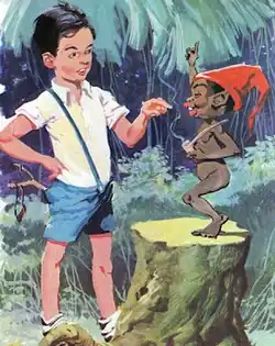 ![]() Pedrinho (esquerda) e o saci-pererê. Uma gravura de Manuel Victor Filho para o livro O Saci. | |