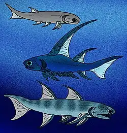 Os primeiros peixes com mandíbulas, os acantodianos, ou tubarões espinhados, apareceram no Siluriano superior, aproximadamente 410 milhões de anos atrás, e vindo a se extinguir no fim do Permiano, aproximadamente 250 milhões de anos atrás. Acantodianos eram geralmente menores que os peixes como os tubarões variando de "filtradores" de alimentos sem dentes a predadores dentados. Eles já foram classificados como uma ordem da classe Placodermi, outro grupo de peixes primitivos, mas recentemente autoridades tendem a colocar os acanthodiaes oou ambos os grupos dividindo um ancestral comum.