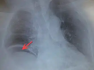 | Ar livre sob o diafragma direito devido a um intestino perfurado | |