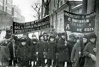 Em Novembro de 1917, poucas semanas após da revolução, foi criado o Comissariado do Povo para o Esclarecimento, que um mês mais tarde criou a União de professores internacionalistas de toda a Rússia, com a finalidade de banir a instrução religiosa dos currículos escolares. A fim de intensificar a propaganda antirreligiosa no sistema escolar, a Glavpolitprosvet (Administração Central de Eclarecimento Político) foi criada em Novembro de 1920.[29]