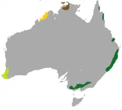 Sudoeste da Austrália Ocidental, Sudeste da Austrália Meridional, Sul de Victoria, leste de Queensland, Território do Norte;
