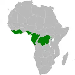 Pode ser encontrada nos seguintes países: Angola, Camarões, República Centro-Africana, República do Congo, República Democrática do Congo, Costa do Marfim, Guiné Equatorial, Gabão, Gana, Guiné, Libéria, Nigéria, Serra Leoa, Tanzânia e Uganda.[1]