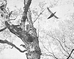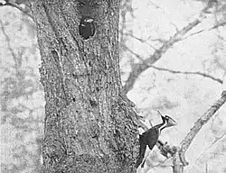 Pica-pau fêmea voltando ao ninho, abril de 1935, da expedição do trato Singer de Allen, Kellogg, Tanner e Sutton. Este pássaro era membro da última população universalmente aceita de pica-paus-de-bico-de-marfim a viver nos Estados Unidos