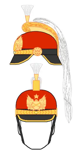 Em 1890[34] e 1894[35] foram feitas novas modificações; sendo adotados revestimentos coloridos nos capacetes, e inseridos modelos com cimeira e crineira para a cavalaria, artilharia de campanha, e bandas de música. Passou também a existir uma variada combinação de cores nos penachos, para as diversas especialidades das Armas e Serviços (artilharia de campanha, artilharia de posição, etc.).