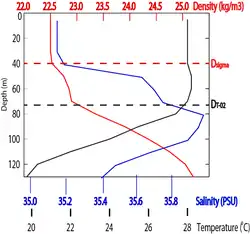 A densidade da água do mar é uma das propriedades físicas mais importantes do oceano por determinar a posição vertical de massas de água e controlar a movimentação dessas massas por convecção, criando uma circulação oceânica. A densidade da água do mar é uma função de temperatura, salinidade e pressão, sendo representada como ρ(S,t,p). Em oceano aberto, a densidade da água do mar possui média entre 1022 e 1030 kg/m3.[3] Para fins de simplificação, os oceanógrafos usam a anomalia de densidade para expressar a densidade da água do mar. Ela é representada pela letra grega sigma (σ), sendo definida como:[4]