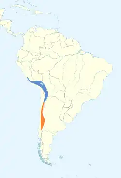 Distribui-se pelo Chile central (cordilheiras entre Atacama e Biobío),[4] e noroeste da Argentina. Migra para o sul e centro do Peru e oeste da Bolívia.[5]