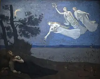 Um artista versátil, Maurice Denis é considerado por alguns o mais talentoso artista simbolista. Além de pintor, foi ilustrador, litógrafo e cenógrafo, além de crítico de arte.[101] Influenciado por Ingres e Puvis de Chavannes, além de Gauguin, Bernard e o grupo Pont-Aven, e com certas reminiscências de Blake e da pré-rafaelita, desenvolveu uma obra de marcante sentimentalismo que denota uma concepção da vida naturalista e piedosa, quase ingênua em sua abordagem de pureza ditosa, em que se destacam o decorativismo, os contrastes cromáticos finos e uma harmonia de linhas puras, com um ar sereno e monumental. Além da produção pictórica, ilustrou livros como Resposta da pastora ao pastor de Édouard Dujardin, Sabedoria de Paul Verlaine, Imitação de Cristo de Thomas de Kempis ou Viagem de Urien de André Gide.[102] Mais tarde, ele se concentrou em arte sacra e pintura mural, e fundou a Estudio de Arte Sacra.[92]