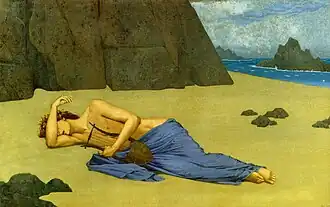 Outra referência avant-la-lettre foi Pierre Puvis de Chavannes, um pintor singular cujo estilo difere totalmente do simbolismo barroco de Moreau, um estilo clássico e sereno que teria sido classificado de acadêmico se não fosse pela eleição de seus temas, onde se aprecia o uso de símbolo e alegoria como meio transmissor da mensagem.[50] foi um muralista notável, um procedimento que o ajudou a desenvolver sua preferência por tons frios, que deram a aparência de pintura a fresco. Tinha um estilo mais sereno e harmonioso, com uma temática alegórica evocando um passado idealizado, formas simples, linhas rítmicas e um colorido subjetivo, alheio ao naturalismo.[59] Em sua juventude passou brevemente pelas oficinas de Delacroix, Coutoure e Chassériau e fez duas viagens à Itália, mas talvez o fator mais importante para a formação de seu estilo sereno e descontraído foi sua relação com a princesa grega Maria Cantacuzena, quem lhe transmitiu sua espiritualidade intensa.[60] Em 1861, com as alegorias de A Guerra e da Paz (Museu Municipal de Amiens) deu início à sua obra muralista, pela qual recebeu inúmeras encomendas em toda a França e que o tornariam famoso.[61] Ele fez murais nas câmaras municipais de Paris e Poitiers, no Panteão, na Sorbonne e na Biblioteca Pública de Boston, entre outros. Seu estilo monumental baseava-se na ausência de profundidade, linearidade construtiva e majestade composicional, bem como na reflexão filosófica inerente às suas cenas.[62] Em 1890 ele fundou com Rodin, Carrière e Meissonnier a Société Nationale des Beaux Arts, que organizou várias exposições de jovens artistas e novas tendências até 1910.[63]