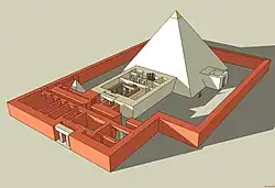 No centro do lado norte da pirâmide, há uma pequena estrutura que devia ter serviço como capela de oferendas, mas da qual restam hoje apenas poucos vestígios.[5] No canto sudeste, havia uma pequena pirâmide de culto, que media 5,2 x 5,2 metros na base e tinha uma altura de cerca de 4,5 metros - significativamente mais íngreme que a pirâmide principal, com uma inclinação de cerca de 60 °. A pirâmide do culto foi feita do mesmo material que a parede externa do complexo.[6]
