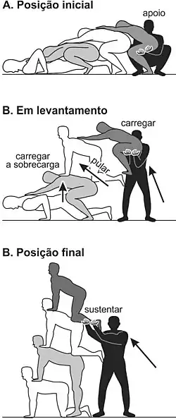 O levantamento da pirâmide é realizado com o comando a voz de “1, 2, 3”. A partir da posição deitada, a base toma a posição de quadrúpedes com os joelhos dobrados em 90° e os braços estendidos em direção vertical. A coluna é estendida em direção reta. A costa não se pode curvar. Com a costa curvada os andares superiores se escorregam e a pirâmide quebra. Olhando para frente e empenando o quadril, a coluna fica estendida. Quando o figurante olha para baixo, a coluna fica curvada. Os braços devem estar em direção vertical a partir dos ombros. Os cotovelos devem estar estendidos. A posição certa deve ser tomada por apenas uma tentativa. Não há a oportunidade para a correção e a segunda tentativa. A pirâmide tem sobrecarga, o que não permite o reajuste. Uma vez que o cotovelo é curvado, não é possível se estender de novo. Todos os pesos se concentram ao componente com cotovelo curvado e a pirâmide quebra a partir dele. Após o levantamento da pirâmide, os componentes que estão nos laterais se encostam ligeiramente no seu peso ao centro da pirâmide.