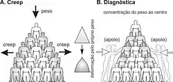 As pirâmides acima citadas têm forma bi-dimensional de parede triangular levantada na postura vertical, sendo chamadas de pirâmide bi-dimensional. Em pirâmides grandes ocorre a deformação pelo próprio peso, chamado de “creep” pela engenharia cível. Devido a isso, a pirâmide expande horizontalmente e quebra por causa da dispersão da força. Este fenômeno aparece na pirâmide de 4 andares e fica expressivo nas pirâmides maiores. A força de dilatação lateral é notável nos terceiro e quarto andares. Desta forma, os figurantes encosta o peso para o centro da pirâmide para concentrar a força. As pirâmides bi-dimensionais têm essa limitação.