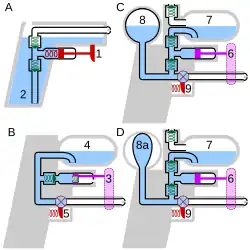 Uma bomba de pistão é outra versão deste sistema. Geralmente, elas são maiores do que pistolas de esguicho e borrifadores. As bombas de pistão não têm gatilho. Em vez disso, elas atiram movendo a bomba para frente e para trás. Embora a bomba de pistão tenha uma vazão maior do que as pistolas de esguicho, elas tendem a ser menos potentes do que pistolas de água pressurizadas.