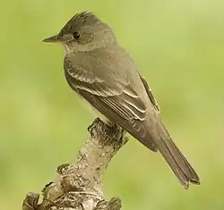 Pewee de madeira oriental, tem duas barras de asa claras e claras e longa projeção primária -