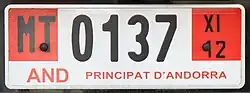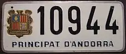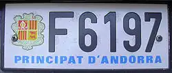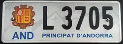 As placas de identificação de veículos de Andorra são compostas por uma letra e quatro dígitos (no formato A1234) e têm o brasão de armas e o código do país (AND) à esquerda da combinação alfanumérica e a inscrição em catalão Principat d'Andorra em azul abaixo da série. As placas caracteres pretos em alto-relevo sobre fundo branco.