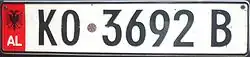KO indica o distrito de Korçë. Este padrão continua válido mesmo após a introdução de modelos posteriores.O formato mais antigo, introduzido em 1993 continuou válido após a introdução do modelo posterior em fevereiro de 2011. Esse formato foi alterado em 1995 com a adição de uma faixa vermelha à esquerda com a indicação nacional AL com o uso da fonte DIN 1451. O espaçamento entre caracteres mudou várias vezes e posteriormente adicionou-se um holograma de segurança. O formato começa com código distrital de duas letras. Por exemplo, a abreviação para o distrito de Korçë é KO. Seguia-se então uma sequência numérica de quatro dígitos, com uma letra serial indicando a ordem de alocação das séries de números. Assim, sabe-se que uma placa que terminasse com B foi emitida posteriormente em relação a outra terminada em A, naquele distrito. Desde 2002, uma fonte menor foi introduzida, sem que as placas anteriores deixassem de ser válidas.
