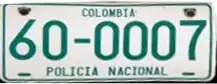 Polícia Nacional | Policía Nacional | verde sobre branco | 12-3456 | A inscrição COLOMBIA é gravada na parte superior da placa e POLICIA NACIONAL" é gravada na parte inferior da placa.