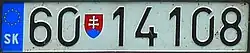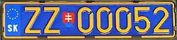 - Em 1 de maio de 2004, a Eslováquia ingressou na União Europeia. A fim de harmonizar a aparência visual das placas do país com o restante da UE, o brasão eslovaco foi substituído pela chamada "eurobanda", uma barra azul vertical com a representação da bandeira europeia.[3] O código do país, SK, foi inserido na eurobanda. O número 0 e a letra O também foram diferenciados, o numeral é cortado por um risco, de forma semelhante à fonte alemã FE-Schrift, utilizada em vários países.