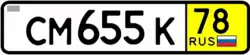 | Os veículos de transporte público (como ônibus, táxis licenciados e táxis compartilhados licenciados) têm caracteres pretos em fundo amarelo e com formato LL NNN. Como esses veículos são relativamente poucos, o código da região não muda com frequência; em Moscou, por exemplo, placas amarelas de "transporte público" ainda recebiam o código 77 em dezembro de 2009. (Nota: este tipo não deve ser confundido com as placas amarelas de aparência semelhante agora extintas, com o formato LL NNN L, que foram emitidas antes de 2002 para carros registrados para empresas estrangeiras que operam na Rússia; o último tipo fo retirado de circulação) | |