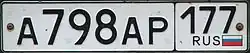 | As placas militares têm caracteres brancos em fundo preto, com formato é NNNN LL para veículos em geral e LL NNNN para reboques. Nesse caso, os dois dígitos à direita não são um código regional, mas um código para o distrito militar, ramo ou serviço das forças armadas ou órgão executivo federal onde o serviço militar é exigido por lei. Por exemplo, NNNN LL 14 rus é um veículo pertencente às tropas ferroviárias, NNNN LL 18 rus denota o Ministério de Situações de Emergência, NNNN LL 23 rus é para as forças estratégicas de mísseis, NNNN LL 21 rus para o Distrito Militar do Sul etc. Ao contrário de todas as outras categorias, as matrículas militares não são refletivas. | |
