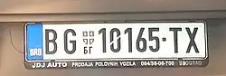 Além disso, as placas possuem iniciais de duas letras em minúsculas no lado esquerdo, escritas verticalmente após a faixa azul indicando a cidade em que foram emitidas - BG indica a capital Belgrado[5] - e dois números no lado direito indicando o ano em que são válidos (por exemplo, 12 para 2012).