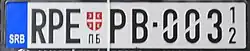 O código regional e o código de licença são separados pelo brasão sérvio e uma combinação de letras cirílicas conforme indicado abaixo. Uma faixa azul fica ao longo da borda esquerda, como nos países da União Europeia, com o código de país ISO 3166-1 alfa-3 da Sérvia (indicativo internacional SRB).