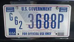 Veículos de propriedade das forças armadas dos EUA podem ter uma placa veicular emitida pela própria instituição em questão, apesar de alguns veículos utilitários não possuírem placa alguma, apenas um número de identificação pintado diretamente na carroceria. O Serviço Postal dos Estados Unidos adota a mesma prática, especialmente para os seus caminhões de entrega.