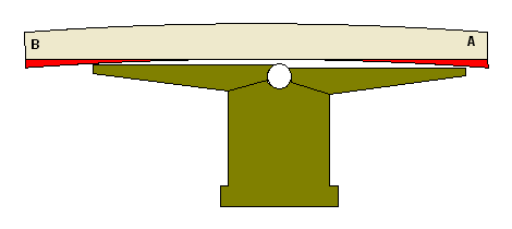 Para endireitar um pedaço de madeira curvada, a base da prancha fica temporariamente afastada da cabeça de corte. A máquina está ligada e a madeira é baixada lentamente para a mesa da máquina, com o lado côncavo voltado para baixo. Alguns cortes são feitos na seção vermelha "A". A madeira é virada de ponta a ponta e o mesmo procedimento é feito na seção "B". Isso é repetido conforme necessário, com o operador observando ao longo do comprimento da madeira de tempos em tempos para verificar a retidão da madeira. Quando a madeira é quase reta, a proteção é substituída e o último corte é feito da maneira normal.