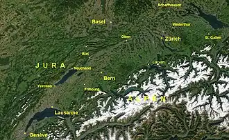 A Norte e a Noroeste o planalto suíço é delimitado geograficamente e geologicamente pela cordilheira do Jura, mas a Sul não existe uma fronteira precisa com os Alpes. Segundo o que se pode ver na imagem junta, a divisão Sul mesmo se não claramente definida, passa por uma linha que liga OSO-ENE que reuni o Lago Lemano ao Lago de Constança e passa por Lausana, Lucerna, São Galo