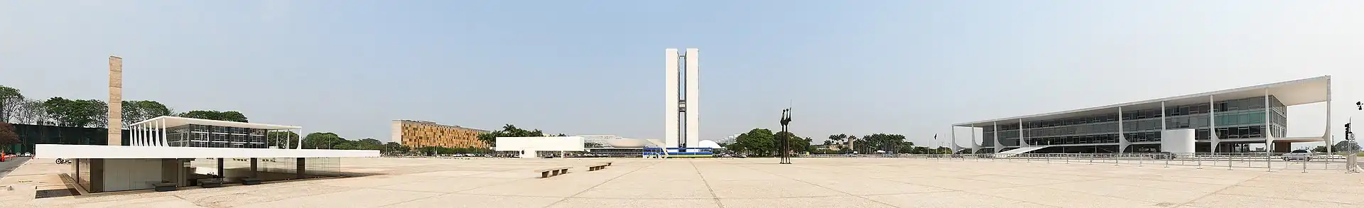 O edifício do Congresso Nacional do Brasil, tal como a maioria dos edifícios oficiais na cidade, foi projetado por Oscar Niemeyer e Joaquim Cardozo seguindo o estilo da arquitetura moderna brasileira. Vistas desde o Eixo Monumental, a calota à esquerda é a sede do Senado e a da direita é a sede da Câmara dos Deputados. Entre eles há duas torres de escritórios. O Congresso também ocupa outros edifícios no entorno, alguns deles interligados por um túnel. Na frente do prédio, há um grande gramado e um lago, enquanto do outro lado do edifício está a Praça dos Três Poderes.[60] O paisagista brasileiro Roberto Burle Marx projetou os jardins modernistas de alguns dos principais edifícios da cidade.[61]