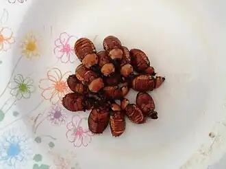- ↑ a b c d e f g h i j k l Smith & Paucar-Cabrera, Andrew (2009). «Taxonomic review of Platycoelia lutescens Blanchard (Scarabaeidae: Rutelinae: Anoplognathini) and a description of the use of this species as food by the people of the Ecuadorian highlands.». Annals of the Entomological Society of America. Consultado em 5 de janeiro de 2019