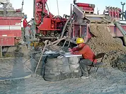• Fluido de perfuração, chamada no jargão do ramo "lama", é bombeado para baixo pelo interior do tubo de perfuração (drill pipe) e sai pela broca de perfuração. A lama de perfuração é uma mistura complexa de fluidos, sólidos e produtos químicos que devem ser cuidadosamente dosados para prover as características físicas e químicas corretas para perfurar o poço com segurança. Funções particulares da lama de perfuração incluem refrigerar a broca, elevar rochas cortadas até a superfície, prevenir a desestabilização da rocha das paredes do poço e sobrepor-se à pressão dos fluidos dentro da rocha de maneira que estes fluidos não entrem no espaço do poço.