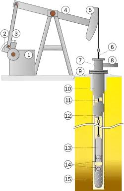 Um esquema de um típico poço de petróleo produzido por uma bomba de vareta, que é usada para produzir o óleo recuperável remanescente após a pressão natural já não ser suficiente para elevar o óleo para a superfície.