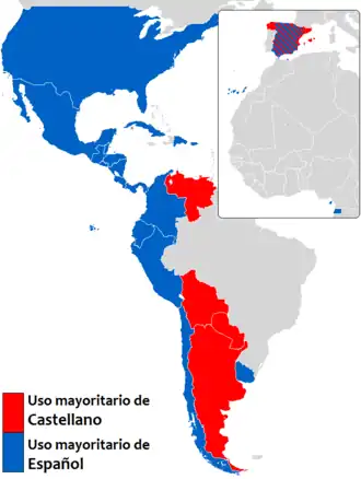 Ainda que a introdução do idioma nos países conquistados fosse anterior à existência da Espanha como Estado moderno, o Diccionario de Lengua Española da Real Academia Espanhola (RAE) apresenta 'castelhano' e 'espanhol' como sinônimos.