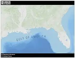 O Serviço Geológico dos Estados Unidos (USGS) recebeu uma proposta para renomear o Golfo do México como Golfo da América em 2006, e o Conselho de Nomes Geográficos [en] (BGN) decidiu por unanimidade não aprová-la.[14][15] A renomeação das águas foi a premissa humorística de um segmento de 2010 do comediante americano Stephen Colbert, que propôs a criação de um "fundo do Golfo da América" para pagar a limpeza necessária após o vazamento de óleo da Deepwater Horizon, afirmando: "Não acho que podemos chamá-lo de Golfo do México mais. Nós o quebramos, nós o compramos."[16]