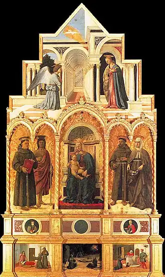 Decididamente inovadora e típica do estilo do artista é a Anunciação, a parte superior do Políptico, situada num claustro luminoso cuja visão ilusionista é considerada entre as expressões máximas de perspectiva da arte do Renascimento.[2]