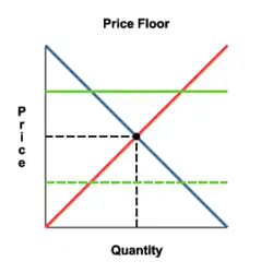 O preço-piso deve ser fixado acima do preço de equilíbrio de livre mercado. No gráfico à direita, a linha tracejada verde representa um preço mínimo fixado abaixo do preço de livre mercado. Neste caso, o piso não tem efeito prático. O governo ou a empresa ordenou um preço mínimo, mas o mercado já tem um preço mais elevado.
