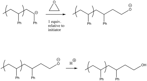 Uma abordagem alternativa para funcionalizar grupos terminais é começar a polimerização com um iniciador aniônico funcional. [1] Neste caso, os grupos funcionais estão protegidos uma vez que as extremidades da cadeia polimérica aniônica são uma base forte. Este método leva a polímeros com pesos moleculares controlados e distribuições estreitas de pesos moleculares. [5]