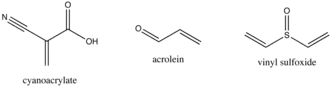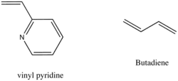 Os monômeros de vinila têm a fórmula CH2=CHR, os mais importantes são o estireno (R = C6H5), o butadieno (CH=CH2) e o isopreno (R = C(Me)=CH2). Uma segunda classe principal de monômeros são os ésteres de acrilato, como acrilonitrila, metacrilato, cianoacrilato e acroleína. Outros monômeros de vinil incluem vinilpiridina, vinil sulfona, vinil sulfóxido e vinil silanos. [2]