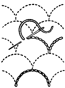 A agulha deve entrar pelo lado direito do tecido e então faz-se um ponto para trás através do tecido.[3]