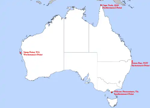 - ↑ Continental Extremities of Australia, Geosciences Australia, consultado em 8 de fevereiro de 2012